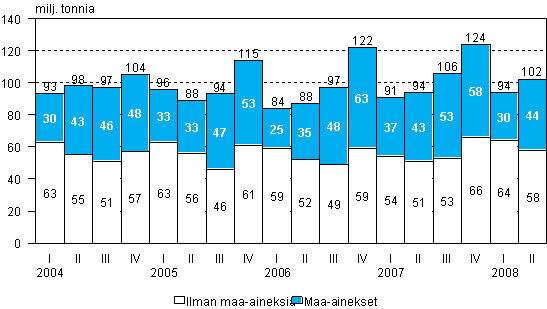 Vuoden 2008 huhti-kesäkuussa kuorma-autoilla kuljetettiin tavaroita yhteensä 102 miljoonaa tonnia. Maa-aineskuljetusten määrä oli 44 miljoonaa tonnia ja muita tavaroita kuljetettiin yhteensä 58 miljoonaa tonnia. Kuorma-autojen kuljetussuorite oli 6 937 miljoonaa tonnikilometriä.