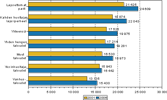 Kuvio 1. Kulutusmenot kotitaloustyypin mukaan 2001 ja 2006 (vuoden 2006 hinnoin, EUR/ kulutusyksikkö)