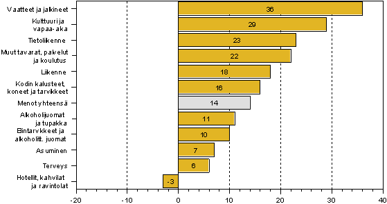 Kuvioon 2 on laskettu kulutuksen pääryhmien reaaliset muutokset. Se kuvaa, miten paljon kulutuksen eri osat ovat kasvaneet, kun otetaan huomioon reaalihintojen ja kotitalouksien kulutusyksikköjen muutokset. Kuviossa huomiota kiinnittävät vaatemenot sekä hotelli- ja ravintolamenot. Vaatemenot kasvoivat eniten. Siitä osa voi johtua tiedonkeruun muutoksista, mutta todellista kasvu oli myös muiden tietolähteiden perusteella arvioituna. Hotelli- ja ravintolamenot laskivat jonkin verran. Sille ei löydy tukea kansantalouden tilinpidon yksityisen kulutuksen tiedoista. Lienee niin, että vuonna 2006 ravintolakulutuksesta on saatu heikommin tietoja kuin vuonna 2001. Alkoholinkulutuksestahan jää kaikissa tutkimuksissa huomattava osa peittoon.