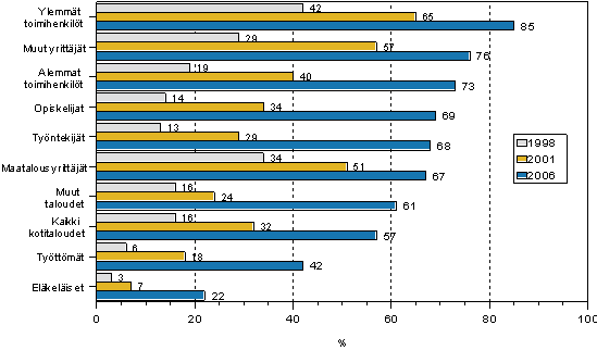 Internetin käyttömahdollisuudet kotona ovat kasvaneet selvästi kaikissa sosioekonomisissa ryhmissä aikavälillä 1998-2006. Vuoteen 2001 verrattuna eri sosioekonomisten ryhmien väliset erot ovat tasoittuneet, kun internetin käyttömahdollisuudet ovat kasvaneet nopeimmin eläkeläisten, työttömien talouksissa ja muiden kotitalouksien ryhmässä. Silti edelleen eläkeläisten ja työttömien talouksissa on vähän internetyhteyksiä verrattuna muihin sosioekonomisiin ryhmiin.