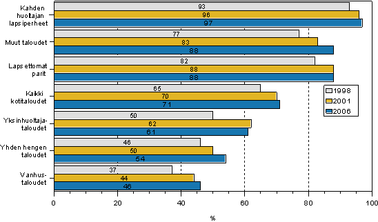 Autollisten kotitalouksien osuus ei ole juurikaan kasvanut vuosina 2001-2006. Kahden huoltajan lapsiperheistä lähes jokaisella on jo auto. Lapsettomilla pareillakin noin 90 prosentilla on auto. Yksinhuoltajien talouksissa autoa käyttävien osuus on jokseenkin vuoden 2001 tasolla. Autoa käyttävien kotitalouksien osuus on kasvanut eniten yhden hengen talouksissa sekä muissa talouksissa, joihin kuuluu joko vähintään kolme työ- ja täysi-ikäistä tai kotitalouden kahdesta aikuisesta toinen on alle 65-vuotias.