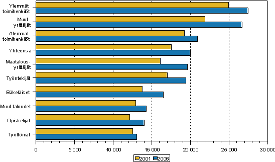Kotitaloudet voidaan ryhmitellä vuosina 2001-2006 tapahtuneiden muutosten perusteella kolmeen eri kulutustasolla olevaan ryhmään. Vuonna 2006 korkean kulutustason ryhmään kuuluivat ylemmät toimihenkilötaloudet sekä muiden yrittäjien kuin maatalousyrittäjien kotitaloudet. Vuonna 2001 ylempien toimihenkilöiden kotitalouksien kulutusmenot olivat selvästi suuremmat kuin muiden, mutta vuoden 2006 tulosten mukaan yrittäjätaloudet olivat lähes saavuttaneet ylempien toimihenkilötalouksien kulutustason (Kuvio 1). Yrittäjätalouksien kulutus kasvoi kaikissa kulutuksen pääryhmissä keskimääräistä enemmän lukuun ottamatta liikennettä ja tietoliikennettä, joihin nämä taloudet käyttivät jo aiemmin merkittävästi rahaa (Taulukko 1). Erityisesti kulttuuri- ja vapaa-ajanmenot kasvoivat yrittäjätalouksilla selvästi, noin 56 prosenttia, ja näiden menojen osuus kaikista kulutusmenoista nousi yhdeksästä prosentista 12 prosenttiin.