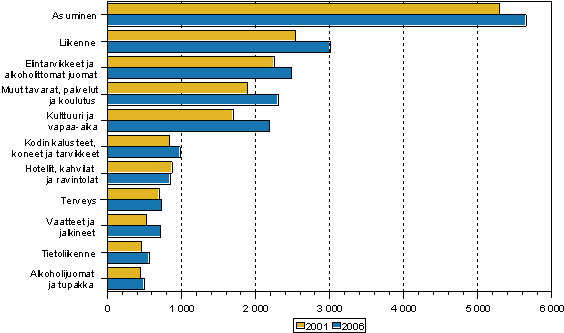Kuvio 2. Kotitalouksien kulutusmenot pääryhmittäin 2001 ja 2006 (vuoden 2006 hinnoin, EUR/kulutusyksikkö)