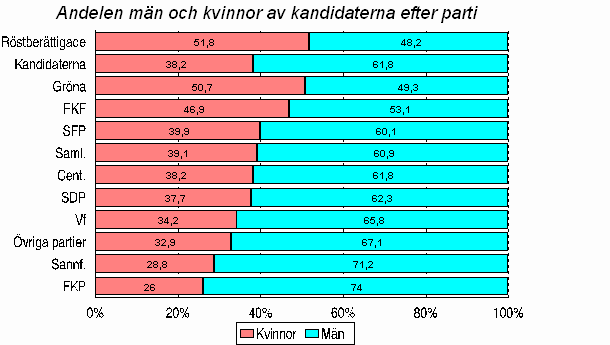 Majoriteten (51,8 procent) av de röstberättigade är kvinnor och av kandidaterna är 38,2 procent kvinnor. Bara Gröna förbundet har kvinnlig majoritet bland kandidaterna (50,7 procent). Näst närmast i jämvikt är Kristliga Förbundet, där andelen kvinnliga kandidater är 46,9 procent. Inom Samlingspartiet, Centern och SDP är andelen kvinnor något under 40 procent. Det finns mest kvinnliga kandidater i landskapet Nyland, 40,5 procent, och minst i Lappland, 35,7 procent.