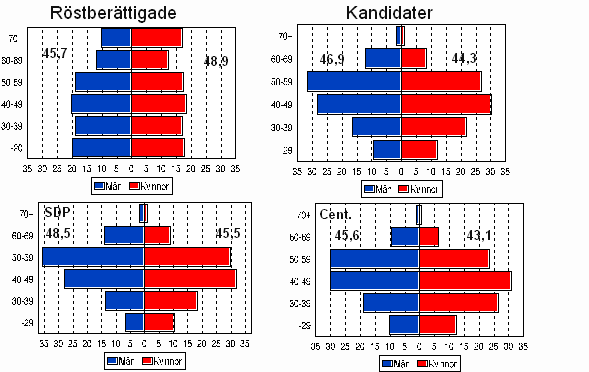 Granskat efter parti är skillnaderna ganska små: bortsett från Gröna förbundet är medelåldern bland de kvinnliga kandidaterna 2-3 år lägre än bland de manliga kandidaterna. Medelåldern är högst inom SDP och Kristliga förbundet, dvs. tyngdpunkten bland männen finns i åldersgruppen 50-59 år och bland kvinnorna i åldersgruppen 40-49 år. Samlingspartiets och SFP:s kandidater är något yngre.