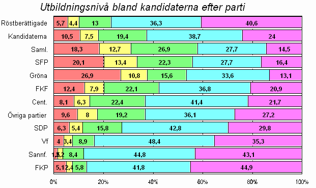 Till sin utbildning avviker kandidaterna klart från de röstberättigade. Av kandidaterna har 76 procent utbildning på högre än grundnivå, medan 59,4 procent av de röstberättigade har någon utbildning efter grundnivån. Samlingspartiet, SFP, Gröna förbundet och Kristliga Förbundet har de flesta kandidaterna med hög utbildning. SDP avviker från dessa partier på den punkten att framför allt andelen kandidater med utbildning på högre nivå är mindre, 27,5 procent. Inom Samlingspartiet är andelen kandidater med utbildning på högre nivå dubbel, dvs. 57,9 procent. Andelen kandidater med akademisk slutexamen är störst inom Gröna förbundet, 26,9 procent. I kommunalval avspeglar utbildningsnivån bland kandidaterna skillnaderna i utbildningsstruktur inom regionerna. Alla stora partier har sina bäst utbildade kandidater i Nyland, medan de kandidater som har lägre utbildning varierar något mellan de östra och mellersta delarna av landet. I Nyland är andelen högt utbildade i allmänhet dubbel jämfört med de områden där kandidaterna har den lägsta utbildningen.