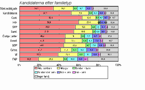 för 57 procent av SFP:s kandidater, för 55 procent av Samlingspartiets kandidater och för 45 procent av SDP:s kandidater. Samboförhållanden är vanligast bland kandidaterna för Gröna förbundet, Vänsterförbundet och FKP, där 15 procent bor tillsammans med en sambo. Det finns flest pensionärer som inte hör till familjer bland FKP:s kandidater.
