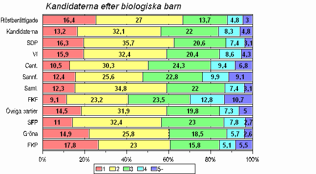Familjetypen säger inget om hur många kandidater som haft egna barn, eftersom barnen i äldre familjer, i skilsmässofall osv. kan bo på annat håll än kandidaten. Antalet biologiska barn visar hur många kandidater som har erfarenhet av egna barn. Av de röstberättigade saknar 35 procent egna barn, bland kandidaterna är motsvarande andel 19,7 procent. Antalet barnlösa varierar mellan 16,9 procent inom SDP och 32,5 procent inom Gröna förbundet. Gröna förbundet har många unga kandidater som kanske inte ännu skaffat barn. Stora familjer är vanligast bland kandidaterna för Sannfinnländarna och Kristliga Förbundet, där 10 procent av kandidaterna har minst fem barn. Också bland Centerns kandidater är familjerna större än bland SDP:s och Samlingspartiets kandidater. Antalet barn till kandidaterna avspeglar nativitetsbeteendet i området, vilket innebär att det finns mest stora familjer i Österbotten, medan familjerna är minst i Nyland.