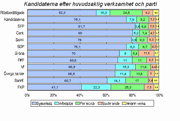 Hälften av de röstberättigade har arbete (52,3 procent), 10 procent är arbetslösa, en fjärdedel är pensionerade och 13 procent studerar eller utför hushållsarbete. Av kandidaterna är klart fler (75 procent) sysselsatta, något färre arbetslösa och betydligt färre pensionerade (bara 9 procent). Andelen sysselsatta är störst bland SFP:s, Centerns och Samlingspartiets kandidater och arbetslöshet är ovanligare än genomsnittet. Bland SDP:s, Gröna förbundets, Kristliga Förbundets och Vänsterförbundets kandidater är arbetslöshet en lika vanlig företeelse som bland de röstberättigade. Gröna förbundet har relativt sett flest studerande kandidater (11,9 procent). Andelen pensionärer är störst i FKP, men högre än medeltalet också i de övriga småpartierna, av vilka en del är särskilda pensionärspartier.