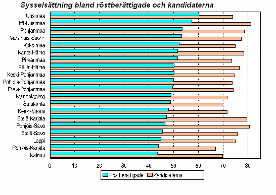 Det relativa sysselsättningstalet bland kandidaterna i landskapet Nyland avviker minst från sysselsättningen inom väljarkåren. Skillnaden i det relativa sysselsättningstalet är bara 15 procentenheter. Som störst är skillnaden mellan kandidaterna och väljarkåren i Södra Karelen och Norra Savolax, där skillnaden i det relativa sysselsättningstalet är ungefär 45 procentenheter. Sysselsättningstalet är till och med högre än i Nyland.