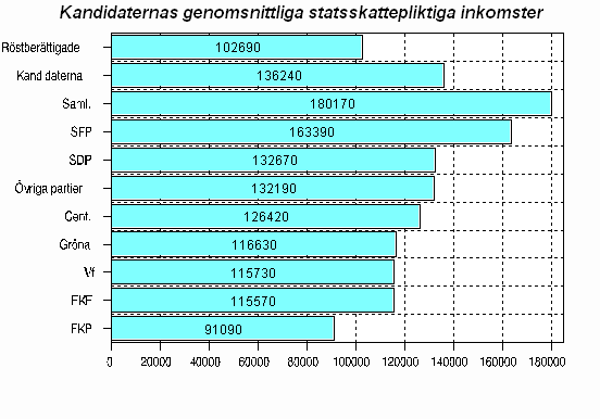 Granskat efter parti varierar inkomsterna mellan Samlingspartiets 180 000 mark och FKP:s 91 000 mark. Medelinkomsterna bland Centerns och SDP:s kandidater var 50 000 mark lägre än bland Samlingspartiets kandidater. De yngre och ofta studerande kandidaterna för Gröna förbundet har i medeltal bara en aning högre inkomster än de röstberättigade.