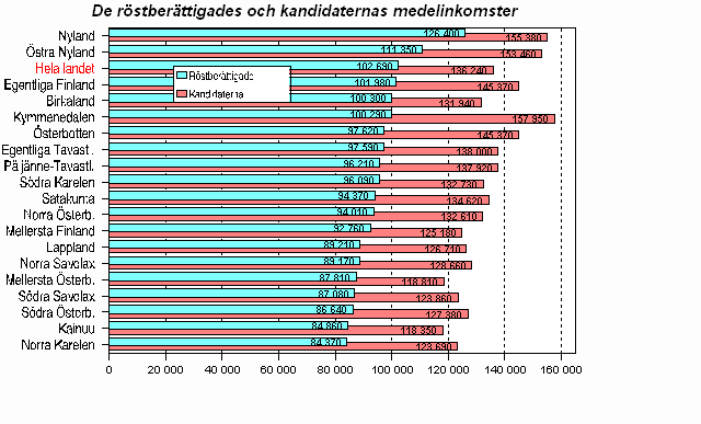 Skillnaden mellan kandidaternas och väljarnas genomsnittliga årsinkomster är minst i Nyland, bara 23 procent, och störst i Kymmenedalen, där kandidaternas medelinkomster är 58 procent högre än väljarnas. Också i Österbotten är skillnaden nästan 50 procent. I de övriga landskapen varierar skillnaden mellan 30 och 45 procent.