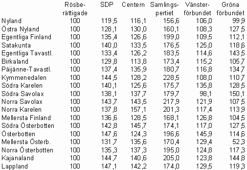 Samlingspartiets kandidater avviker mest från väljarkåren i området: som störst är skillnaden i Kymmenedalen, där kandidaternas genomsnittliga årsinkomster är 2,3-faldiga jämfört med de röstberättigades. Också i Savolax, Norra Karelen, Egentliga Finland, Kajanaland och Norra Österbotten har Samlingspartiets kandidater dubbla inkomster jämfört med väljarna. Minst är skillnaden mellan kandidaterna och väljarna i Nyland, 57 procent. SDP avviker tydligast från väljarkåren i Lappland, där skillnaden är 47 procent, och minst i Nyland, där skillnaden är 20 procent. Centerns kandidater avviker mest från väljarkåren i Norra Karelen (57 procent) och minst i Nyland (16 procent). Också Vänsterförbundets och Gröna förbundets kandidaters årsinkomster avviker som mest med 35-50 procent från inkomsterna inom väljarkåren. I en del landskap är kandidaternas inkomster rentav lägre än inkomsterna i landskapet i medeltal. För Vänsterförbundet gäller detta i Södra Savolax och för Gröna förbundet i Mellersta Österbotten och i Nyland.