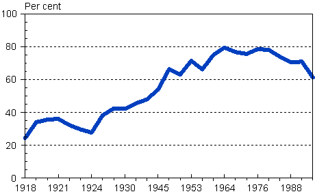 Figure 1. Voting turnout in municipal elections 1918-1996, (%)