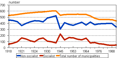 Figure 2. Number of municipal councils with non-socialist and socialist majority, respectively, and the total number of municipalities 1918-1992