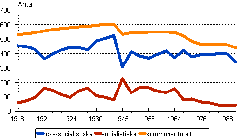 Bild 2. Antalet kommunfullmäktige med borgerlig respektive socialistisk majoritet och totalantalet kommuner 1918-1992
