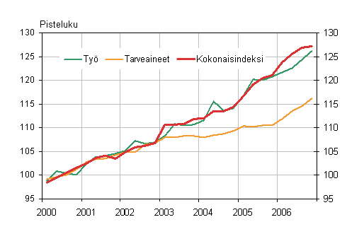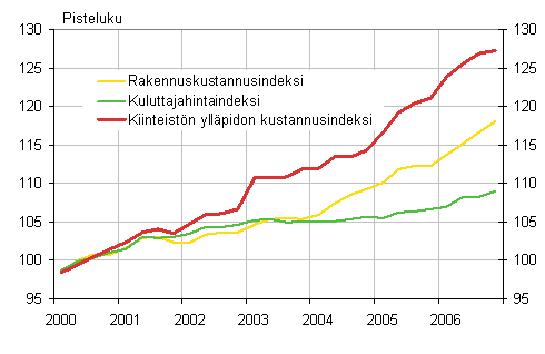 Kiinteistön ylläpidon kustannusindeksi nousi vuoden 2006 neljännellä neljänneksellä edellisen vuoden vastaavasta neljänneksestä 5,1 prosenttia. Talotyypeittäin tarkasteltuna eniten nousivat asuinkerrostalon ylläpitokustannukset 6,1 prosentilla, toimistorakennuksen 5,4 prosentilla, myymälärakennuksen 4,9 prosentilla sekä terveyskeskuksen ylläpidon kustannukset 4,4 prosentilla. Kokonaisindeksiin sisältymätön omakotitalon indeksi osoittaa ylläpidon kustannusten nousseen 2,5 prosenttia loka-joulukuussa vuoden takaiseen verrattuna.