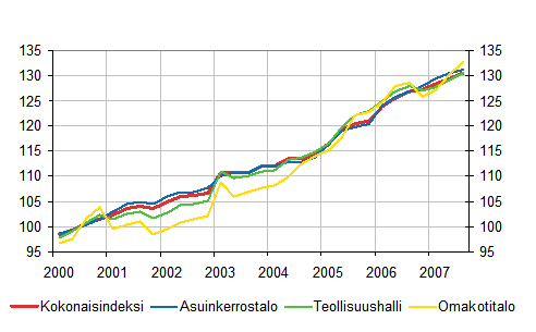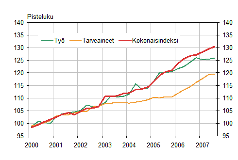 Kiinteistön ylläpidon kustannusindeksi nousi vuoden 2007 kolmannella neljänneksellä edellisen vuoden vastaavasta neljänneksestä 2,8 prosenttia. Talotyypeittäin tarkasteltuna eniten nousivat asuinkerrostalon ja toimistorakennuksen ylläpitokustannukset 3,4 prosentilla ja myymälärakennuksen 2,8 prosentilla. Terveyskeskuksen ja koulurakennuksen ylläpidon kustannukset nousivat 2,1 prosenttia ja teollisuushallin 2,0 prosenttia. Kokonaisindeksiin sisältymätön omakotitalon indeksi osoittaa ylläpidon kustannusten nousseen 3,2 prosenttia heinä-syyskuussa vuoden takaiseen vastaavaan ajanjaksoon verrattuna.