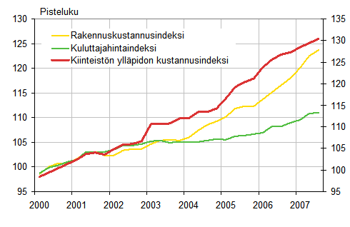 Vertailtaessa kiinteistön ylläpidon kustannusindeksiä, rakennuskustannusindeksiä ja kuluttajahintaindeksiä, on kiinteistön ylläpidon kustannusindeksin nousu vuoden 2007 aikana tasaantunut, kun taas rakennuskustannusindeksin nousu on kiihtynyt vuoden 2006 loppuvuodesta lähtien. Kuluttajahintaindeksi jatkaa pientä tasaista nousuaan.