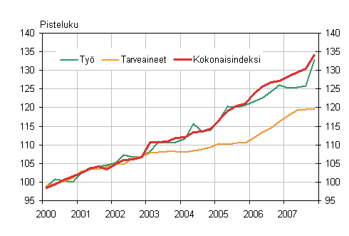 Kiinteistön ylläpidon kustannusindeksi nousi vuoden 2007 neljännellä neljänneksellä edellisen vuoden vastaavasta neljänneksestä 5,4 prosenttia. Talotyypeittäin tarkasteltuna eniten nousi teollisuushallien ylläpitokustannukset 6,4 prosentilla. Asuinkerrostalojen ylläpitokustannukset nousivat 5,0 prosenttia, myymälärakennusten 4,9 prosenttia, toimistorakennusten 3,7 prosenttia, terveyskeskusten 5,1 prosenttia ja koulurakennusten 5,4 prosenttia. Kokonaisindeksiin sisältymätön omakotitalon indeksi osoittaa ylläpidon kustannusten nousseen 8,3 prosenttia viime vuoden loka-joulukuussa vuoden 2006 vastaavaan ajanjaksoon verrattuna.