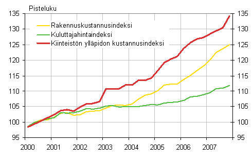 Vertailtaessa kiinteistön ylläpidon kustannusindeksiä, rakennuskustannusindeksiä ja kuluttajahintaindeksiä, on kiinteistön ylläpidon kustannusindeksin ja rakennuskustannusindeksin nousu vuoden 2007 aikana ollut suunnilleen sama eli viiden ja puolen prosentin molemmin puolin. Kuluttajahintaindeksi sen sijaan jatkaa pientä tasaista nousuaan.