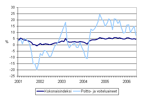 Eniten kokonaisindeksin nousuun vaikuttivat poltto- ja voiteluaineiden kallistuminen sekä palkkojen ja välillisten palkkojen korotukset. Poltto- ja voiteluaineiden hinnat nousivat vuodessa 7,7 prosenttia, palkat ja välilliset palkat 4,0 prosenttia. Korkokustannukset nousivat vuodessa yli 27 prosenttia.