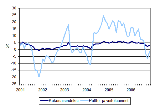 Linja-autoliikenteen kaikkien kustannusten sekä poltto- ja voiteluainekustannusten vuosimuutokset 1/2001 - 11/2006