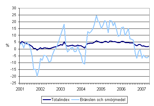 Årsförändringar av alla kostnader för busstrafik samt kostnaderna för bränslen och smörjmedel 1/2001 - 5/2007