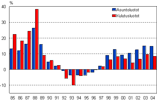 Kotitalouksien asunto1)- ja kulutusluottokannan2) kehitys 1985-2004, muutos edellisestä vuodesta, %