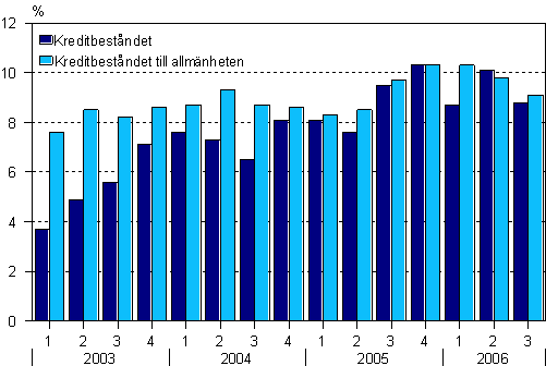 Utvecklingen av kreditbeståndet och kreditbeståndet till allmänheten efter kvartal åren 2003-2006, förändring från motsvarande kvartal året innan, %