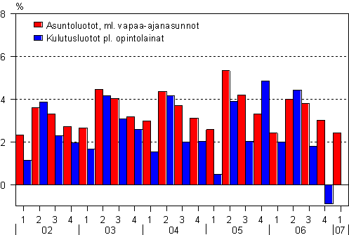 Korjattu 9.7.2007. Kuviossa on korjattu vuoden 2007 1. neljänneksen kotitalouksien kulutusluottokantaa koskeva tieto.