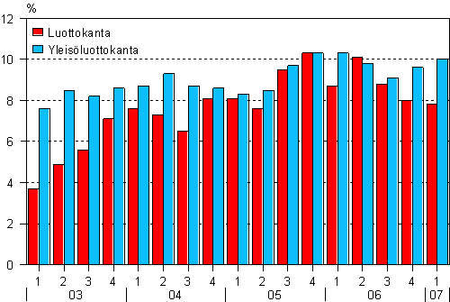- Luottokannan ja yleisöluottokannan kehitys neljänneksittäin, muutos edellisen vuoden vastaavasta neljänneksestä, % (4.7.2007)