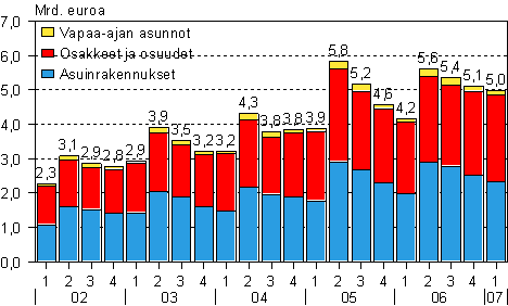 - Kotitalouksien uudet asuntoluotot käyttötarkoituksen mukaan neljänneksittäin, Mrd. euroa (4.7.2007)