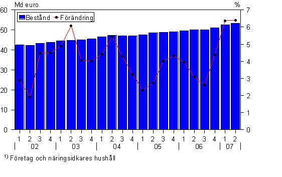 Kreditbeståndet för företagsverksamhet, dvs. för företag och näringsidkarhushåll, uppgick i slutet av det andra kvartalet år 2007 till drygt 53 miljarder euro, dvs. 6 procent mer än året innan och drygt en procent mer än i slutet av föregående kvartal. Under kvartalet lyftes nya krediter för företagsverksamhet för 10 miljarder euro.