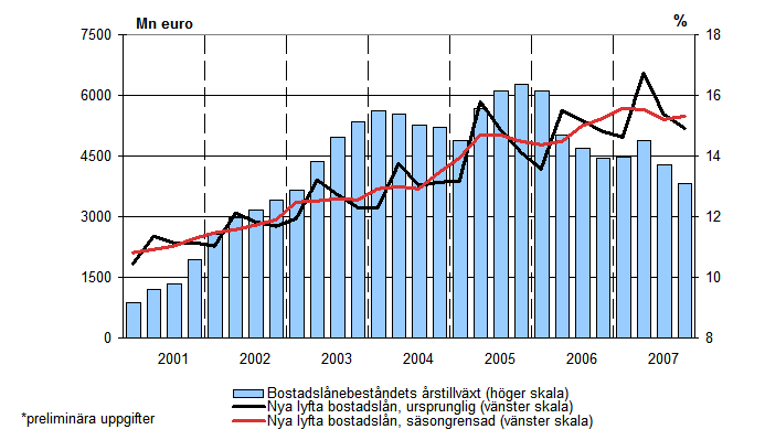 Hushållens bestånd av bostadslån ökade fortfarande stadigt, men ökningen blev långsammare i slutet av år 2007. Beståndet ökade med 13 procent under året. Den allmänna ökningen av räntenivån har förmodligen för sin del påverkat tillväxttakten för hushållens bestånd av bostadslån. Också lyftandet av nya bostadslån har säsongrensat minskat något jämfört med kredittoppen i början av år 2007. Under år 2007 lyfte hushållen dock bara något under tio procent fler nya bostadslån än föregående år, dvs. drygt 22 miljarder euro.
