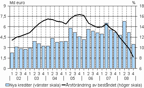 Beloppet av de krediter som inhemska finansiella företag och försäkringsföretag, staten och socialskyddsfonder beviljar hushållen var totalt drygt 93 miljarder euro i slutet av år 2008. Hushållens kreditbestånd ökade med något under åtta procent under året. Av hushållens kreditbestånd var mer än 69 miljarder euro bostadslån och lån för fritidsbostäder, drygt åtta procent mer än året innan. Den årliga tillväxten av hushållens bestånd av bostadskrediter har halverats från rekordsiffrorna år 2005. Under år 2008 lyfte hushållen nya bostadslån för totalt drygt 20 miljarder euro, dvs. nio procent mindre än året innan. Hushållens konsumtionskrediter och studielån uppgick i slutet av året till något under 15 miljarder euro. Siffrorna framgår av de slutliga uppgifterna för år 2008 i Statistikcentralens statistik över kreditbeståndet. De preliminära uppgifterna som publicerades i mars 2009 är oförändrade.