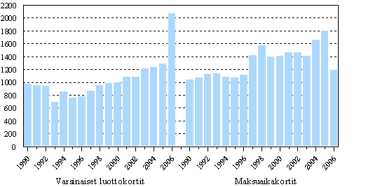 Aktiiviset korttitilit vuosina 1990 - 2006, 1000 kpl