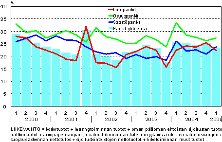 Kotimaisten pankkien liikevaihto oli vuoden 2005 ensimmäisellä neljänneksellä yhteensä 1 793 milj. euroa eli 314 milj. euroa enemmän kuin edellisvuoden vastaavana ajankohtana. Liikevoitto/liikevaihto-suhdeluku oli 23,5 prosenttia. Korkeimmillaan suhdeluku on 2000-luvulla ollut 30,5 prosenttia vuoden 2001 viimeisellä neljänneksellä. Tiedot ilmenevät Tilastokeskuksen luottolaitosten tuloslaskelmia ja taseita koskevista tiedoista.