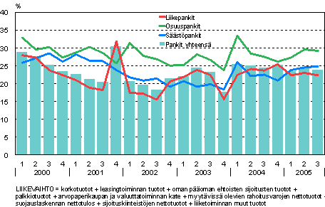 Kotimaisten pankkien liikevoitto/liikevaihto -% neljännesvuosittain 2000-2005