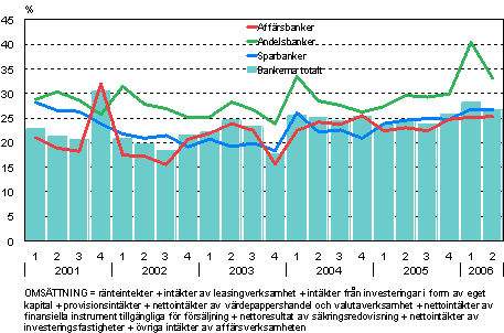 Under januari-juni år 2006 uppgick de finländska bankernas omsättning till totalt 4 721 miljoner euro, dvs. 28 procent mer än under motsvarande period året innan. Av omsättningen erhölls 2 298 miljoner euro under det första kvartalet och 2 423 miljoner under det andra kvartalet.