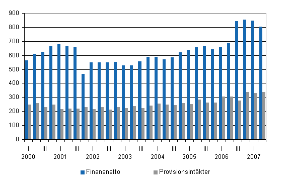 De inhemska bankernas finansnetto uppgick till 1 650 miljoner euro under januari-juni år 2007. Finansnettot ökade under det första halvåret med 22 procent jämfört med det första halvåret år 2006. Bankernas provisionsintäkter var 671 miljoner euro under januari-juni, vilket var en ökning på nio procent jämfört med motsvarande period året innan.