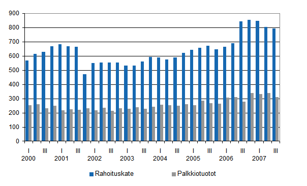 Pankkien rahoituskate oli vuoden 2007 tammi-syyskuussa 11 prosenttia korkeampi kuin vuoden 2006 vastaavalla jaksolla. Rahoituskatteen kasvu on kuitenkin hidastunut. Verrattaessa vuoden 2007 kolmannen neljänneksen rahoituskatetta vuoden 2006 kolmannen neljänneksen tilanteeseen havaitaan, että rahoituskate pieneni 6 prosenttia.