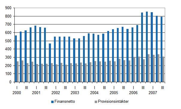 Bankernas finansnetto var 11 procent högre under januari-september år 2007 än under motsvarande period år 2006. Ökningen av finansnettot har dock avtagit. Vid en jämförelse av finansnettot för tredje kvartalet år 2007 med situationen för tredje kvartalet år 2006 ser man att finansnettot minskade med 6 procent.