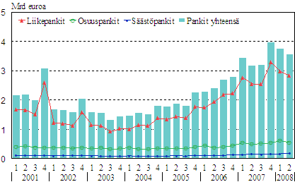 Kotimaisten pankkien liikevaihto neljännesvuosittain vuosina 2001-2008