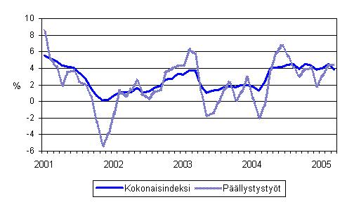 Maarakennusalan kaikkien kustannusten sekä päällystystöiden kustannusten vuosimuutokset 1/2001 - 3/2005