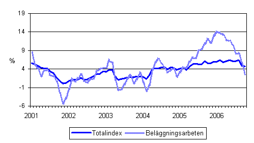 Årsförändringar av alla kostnader inom mark- och anläggningsbranschen samt av kostnaderna för beläggningsarbeten 1/2001 - 10/2006