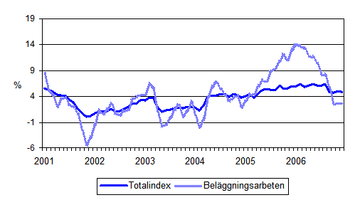 Årsförändringar av alla kostnader inom mark- och anläggningsbranschen samt av kostnaderna för beläggningsarbeten 1/2001 - 12/2006