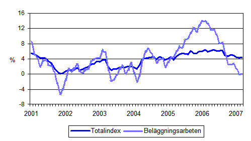 Årsförändringar av alla kostnader inom mark- och anläggningsbranschen samt av kostnaderna för beläggningsarbeten 1/2001 - 3/2007