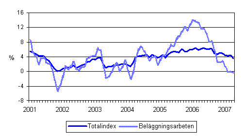 Enligt Statistikcentralen ökade kostnaderna inom mark- och anläggningsbranschen med 3,6 procent från april år 2006 till april år 2007. Årsförändringen varierade efter slag av arbete från -0,4 procent för beläggningsarbeten till 8,2 procent för brobyggnadsarbeten.