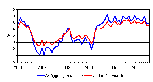 Kostnaderna för anläggningsmaskiner ökade med 5,5 procent från juli år 2005 till juli år 2006. Kostnaderna för underhållsmaskiner ökade med 5,1 procent och kostnaderna för de traditionella anläggningsmaskinerna med 5,7 procent. Kostnaderna för mobilkranar gick upp med 5,8 procent. Uppgifterna framgår av Statistikcentralens kostnadsindex för anläggningsmaskiner.